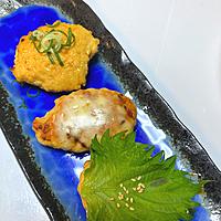 - 8 7の2個に大葉をのせ、白いりごまをかけます。白髪ねぎ、白いりごまを2個ずつかけ、チーズの上に小ねぎをのせます。