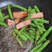 - 1 さやいんげんは筋を取り、斜めに3等分に切ります。ブロックベーコンは1cm幅に切ります。