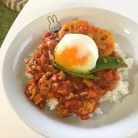 家にあった鶏ひき肉、カレーフレークで代用したので、カレー風味のトマト煮込みのような仕上がりに。