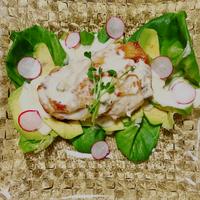 - 4 ベビーリーフをのせたお皿に2を盛り付け、3をかけて完成です。