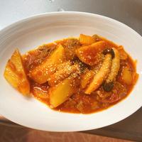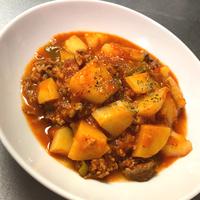 - 4 中火のまま2、カットトマト缶、水、(A)を加え全体に味がなじむように混ぜ、ひと煮立ちしたら弱火にし蓋をして、じゃがいもがやわらかくなるまで15分程煮て火から下ろします。