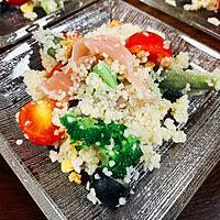 クスクスにたっぷりの野菜を入れた、フランスの定番総菜、タブレをアレンジいたしました。クスクスはセモリナ粉でできたパスタですが小粒なのでお湯で蒸らすだけで簡単に使用できます。クスクスのつぶつぶ感と野菜のシャキシャキ触感がよく合います。ぜひお試しください。