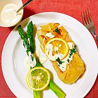 - 4 付け合わせのアスパラと、タルタルソースを添えて完成です。