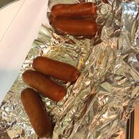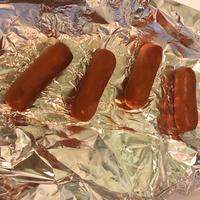 - 2 アルミホイルを敷いた天板に1のウインナーをのせ、オーブントースターで焼き色がつくまで5分程度焼きます。