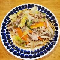 キャベツ1/6玉、人参1/2本、長ネギ1/2本、もやし1/2袋、キクラゲ、コーン、豚こまを入れて2人前を。皿うどんの麺がスーパーにあったので。簡単で美味しく子供も大好物です。