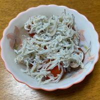- 4 大葉を敷いたお皿に汁気を切った3を盛りつけ、釜揚げしらすをのせて完成です。