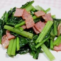 ベーコンを炒めたあと茎の部分を先に炒め葉の部分はサッと炒めるようにしています