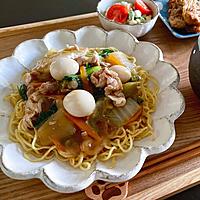 冷蔵庫の残り野菜(白菜、もやし、エリンギ、玉ねぎ)で作ったので彩りはイマイチですがおいしかったです。ランチにささっと作れるレシピで助かります😄