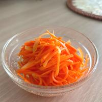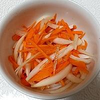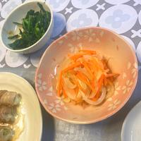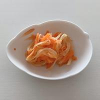 玉ねぎとにんじんのナムルのご紹介です。細く切った玉ねぎとにんじんを和えたナムルです。鶏ガラスープの素が効いています。ごま油の風味もよく合いおいしいですよ。ぜひお試しください。