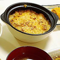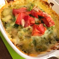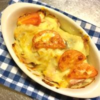- 6 グラタン皿に5を入れ、ミニトマトを置き、ピザ用チーズを乗せたら、チーズに焦げ目がつくまでオーブントースターで13分焼きます。