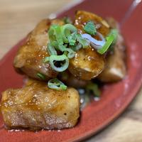 焼き豆腐を豚バラ肉で巻いてボリュームアップした一品です。片栗粉をまぶして一度こんがり焼くことであんがよく絡み、とてもおいしいですよ。節約したいときにもおすすめのメニューです。ぜひ作ってみてくださいね。