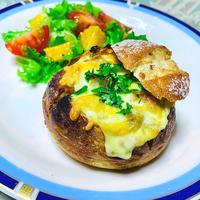 - 4 チーズが溶けてこんがりと焼き色がついたら、オーブントースターから出します。一緒に焼いたパンの中身でできたクルトンをトッピングしたら完成です。