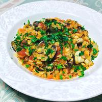 鈴木シェフのボンゴレビアンコのレシピを参考にしてアサリは殻を炒めて旨みを引き出しています。コンソメの代わりにアンチョビを使い、湯むきしたミニトマト追加。パルミジャーノレッジャーノをたっぷりすりおろして混ぜ込みました。いつも食べている5割もち麦ご飯使用、仕上げにイタリアンパセリ。