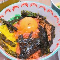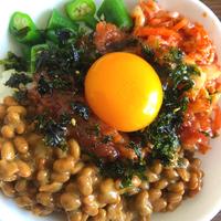- 5 お皿に納豆、2、4を盛りつけ、真ん中に卵黄を乗せます。3を乗せ、残りの韓国のりを添えて完成です。