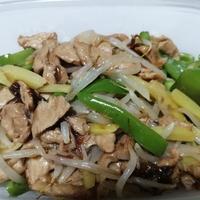 - 6 新生姜が透き通ったら中火のまま、4、残りの3を入れて炒めます。ピーマンがしんなりとしたら残りの1、水を入れて炒めます。