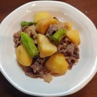 牛肉200gじゃがいも多め5.6個、甘ししとう4本(少なかったのであとからピーマン追加)、味噌大2、砂糖大1、三倍濃縮つゆのもと大2で作りました。味噌のコク?があって美味しかったです♪2023/7/5