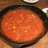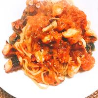 昨日の残りのタコ刺身と在庫処分のホール缶でつくりました。鷹の爪をたして、煮込むときにローレルを入れました。とっても美味しいです!