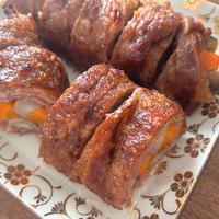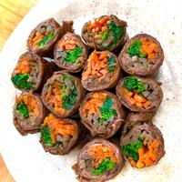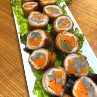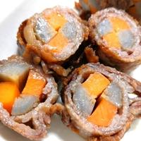 牛肉の薄切りで根菜を巻き上げた見た目も華やかな一品です。ゴボウやニンジンをたっぷり巻き込み、じっくりと調味料を絡めることで、お肉は柔らかく、根菜の旨みが凝縮されたジューシーな仕上がりに。お弁当のおかずにもぴったりで冷めても美味しく頂けます。インゲンや小松菜を加えると彩りも鮮やかに。豚ロース肉でも代用可能で、切り口の美しさと味わい深さが特徴的な一品です。