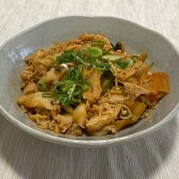 - 4 1とキムチ、(A)を入れて中火で全体がしんなりするまで炒め、火を止めます。