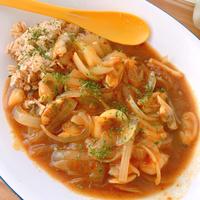シーフードは加熱しすぎると硬くなりますので、サッと火を通して取り出しておき、最後にカレールーに混ぜてひと煮立ちする程度で美味しく召し上がれます。 今回は炒め物用の生のシーフードミックスを使いました。冷凍のものを使っても美味しく作れますが、解凍して水分をよく拭き取ってから使ってください。 玉ねぎは予め電子レンジで加熱しておくと、炒める時間が短縮できます。 カレールーはご家庭でご使用のもので結構です。水の量に合わせて、ルーの量を調整してください。