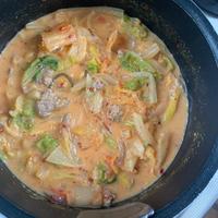 豚肉は豚挽き代用。出来上がりが全然キムチ感なかったので、最後にキムチ➕50足しました。なので、スープの色もキムチっぽくなりましたが、美味しい。。白菜は外葉を3枚だけ使いましたが、具沢山のスープになりました。
