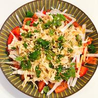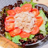 大葉の爽やかな香りが食欲をそそる夏にぴったりのさっぱりサラダです。ササミの淡白な味わいに、トマトの酸味が絶妙なバランス。甘酸っぱいドレッシングがトマトやササミと相性抜群で、もりもり食べられます。大根、きゅうり、レタスなど好みの野菜を加えてアレンジ自在。ドレッシングは胡麻油と生姜が効いていて、豆腐にかけたり、普段のサラダに使ったりと活用の幅が広いのも魅力です。