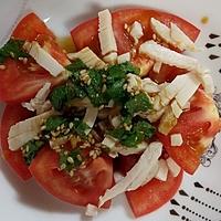- 6 器に2のトマト、大根、4の順に盛り付け、5をかけて完成です。