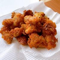 - 3 鍋底から5cm程の高さまで揚げ油を注ぎ170℃に温めたら、2をこんがりときつね色になり火が通るまで3分ほど揚げ、油切りをします。