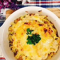 - 8 グラタン皿の中心を開けるように4を詰めて、中心の部分に7を入れたら、ピザ用チーズをのせます。