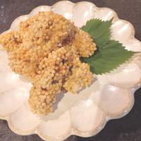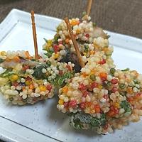 - 5 3に薄力粉をまぶし、4、小粒あられの順に衣を付けます。