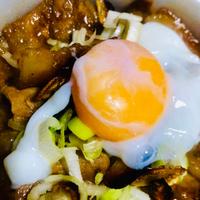 とろーり卵がまろやかアクセントでお腹に溜まる焼肉丼を抑え、長ネギはさっぱり後味の後押し( ˘ᵕ˘ )