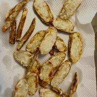 ごぼうが残っていたので作ってみました。ごぼうを1分ほどレンチンした後に、片栗粉をつけて揚げ、最後に青のりと黒瀬のスパイスを振りかけました。程よい柔らかさで美味しかったです。