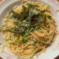 フライパンにバターで豆苗を炒めて茹でたパスタと明太子を入れて混ぜました。