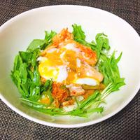- 5 器に4、2、温泉卵を盛り付け、小ねぎ、白いりごまをかけて完成です。