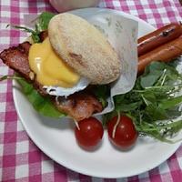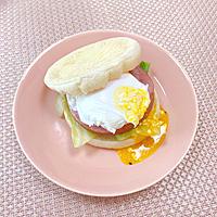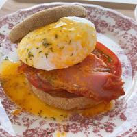 - 10 イングリッシュマフィンにレタス、ハム、ポーチドエッグを乗せ、ソースをかけて完成です。