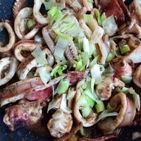 - 4 イカに火が通ったら、小ねぎと七味唐辛子をかけて完成です。