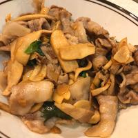 - 2 良い香りがしてきたら、大体の大きさに切った豚バラ肉とエリンギを入れ炒め、(A)を入れて味付けをします。