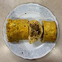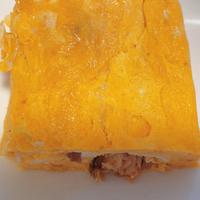 - 3 中火で熱した卵焼き器にサラダ油を入れてキッチンペーパーで伸ばし、2の1/4量を入れて、1の身をのせて焼き、卵の縁が固まってきたら半分に折り、奥にずらします。