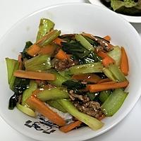 - 4 2を入れて中火で炒め、全体に油がまわったら1の茎の部分を入れて炒め、しんなりしたら1の葉の部分、水、(B)を入れて全体に味がなじむまで炒めます。