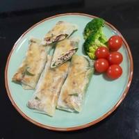 - 4 春巻きの皮に1、2、3の順にのせて巻き、巻き終わりの部分に水溶き薄力粉をつけて留めます。同様に3つ作ります。