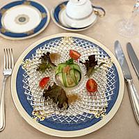 包んだあと、卵から水が出ますので、別容器で作り、サーブ時に水を切って、盛り付けました。クリスマスだったのでサーモンを星型に抜いて飾りました。ソースは玉ねぎドレッシングにしました。