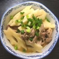 - 4 豚バラ肉に火が通ってきたら調味料と1を加え中火で煮て、煮汁が半分になったら火を止めます。