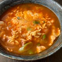 インスタントラーメンがベースなのに、本格的な韓国の味わいが楽しめる一品です。豚肉やウインナー、もやし、キムチ、豆腐などお好みの具材を加えれば、ボリューム満点に。ピリッと効いた辛さとコクが特徴で、最後にとろけるチーズをのせれば、まろやかな味わいに。はちみつを加えることで、辛さの中にも程よい甘みが生まれ、より奥深い味わいを楽しめます。