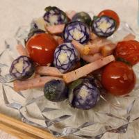 - 1 芽キャベツは半分に切ります。耐熱ボウルに入れてラップをし、600Wのレンジで2分加熱します。