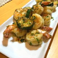 ズッキーニも入れてみました。シンプルな味付けが旨味を引き立てておいしく完食できました。片栗粉でエビの臭みをとるひと手間、大事ですねー!