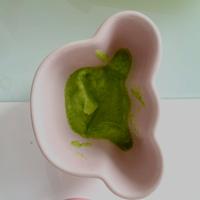 茹でて裏ごししました。裏ごし網の裏面に出て来るまでじっくり擦りました。初ブロッコリー、一瞬渋い表情をしましたが食べてくれました。