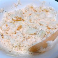 - 2 ラップ、キッチンペーパーを外し、じゃがいもをフォークで一口大に崩します。明太子、クリームチーズを加えて混ぜ合わせ、ふんわりとラップをし600Wの電子レンジで1分加熱します。