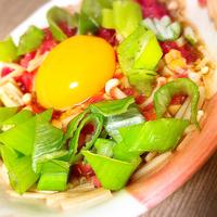 - 4 お好みで、長ネギ、卵黄をのせて完成です。