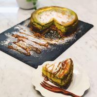 いつものチーズケーキを、プレーンの生地と抹茶の生地に分け、順に流し込むだけで切るとしましま模様になるチーズケーキのご紹介です。 今回は抹茶味のご紹介ですが、ココアパウダーやいちごパウダー等様々なアレンジをお楽しみいただけますよ。