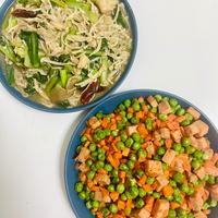 - 3 フライパンにごま油をひき、すりおろし生姜、鷹の爪輪切りを入れ中火で加熱します。香りが立ってきたら、2を入れ塩こしょうをして炒めます。
